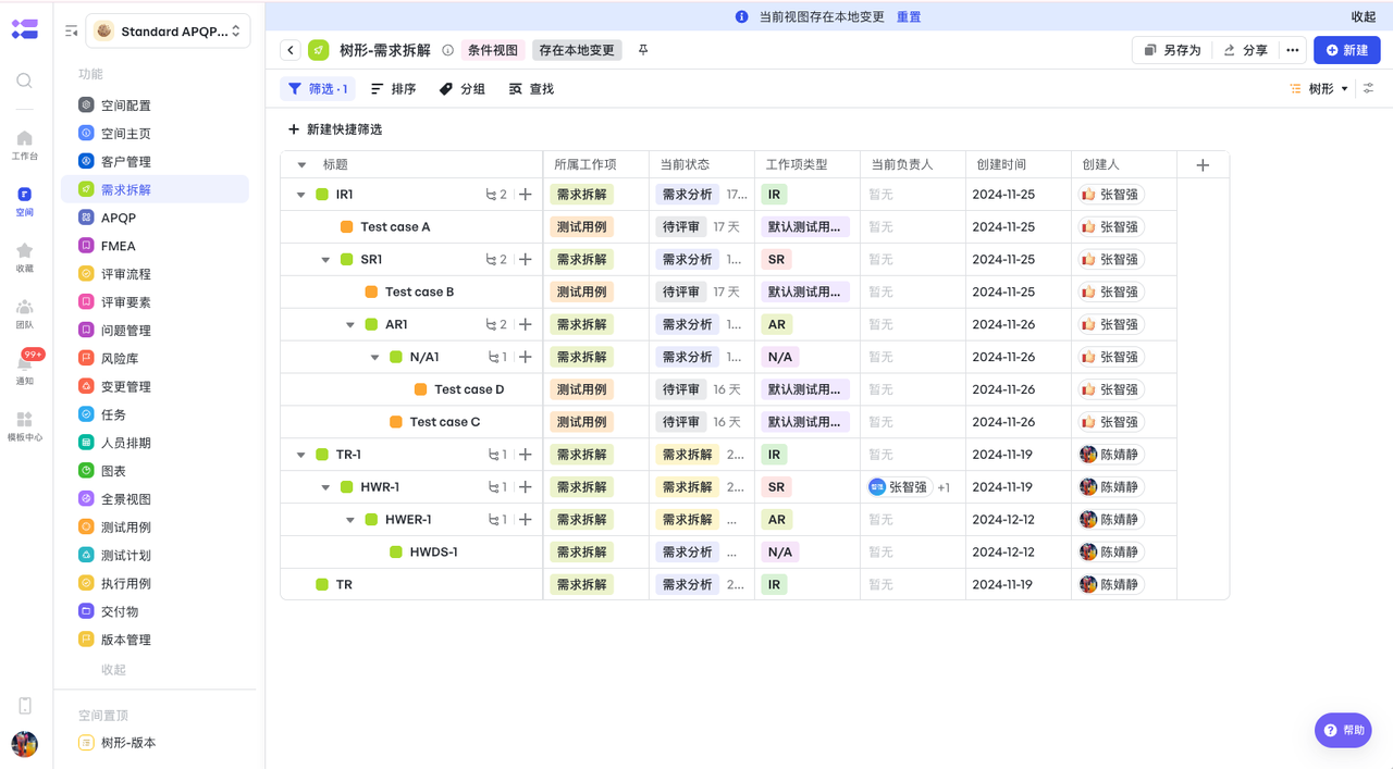 遵循V模型进行逐层拆解追踪,在测试验证阶段也可以按照最末级需求进行验证,逐层验证,保证需求质量,需求模块在APQP模型中,是基石地位,可以解决没有统一完善需求管理规则(不同层级);各层级需求追踪困难;需求很验证无法对标,质量得不到保证;针对变更情况,无法定位变更分支(层级树);任务分配不明确,工作进度不可控等常见需求管理的痛点。