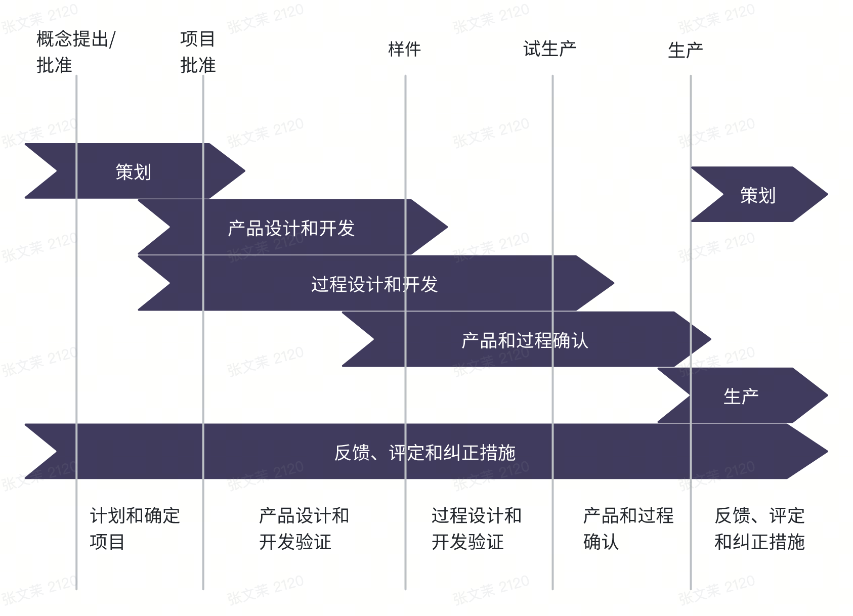 APQP 一般分 5 个阶段进行管控,通过对项目团队人员和可交付成果的管控及风险把控,实现最终产品交付验证,对项目全生命周期任务管理,保证产品按时交付,满足客户在性能、成本和质量等方面的满意度。需注意,APQP 手册中的“产品”包含实体产品和服务。