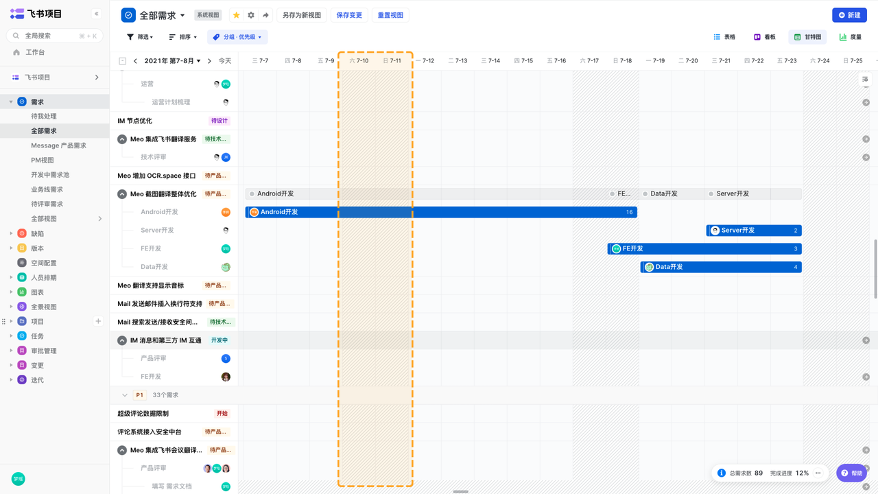需求可视化,通过甘特图快速排期。直观展示需求整体排期,在甘特图绘制区,通过日期区域的背景颜色,也可以明确区分工作日与节假非常的方便。