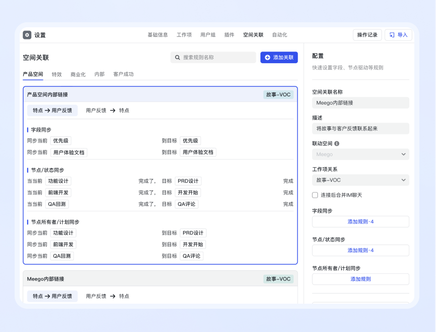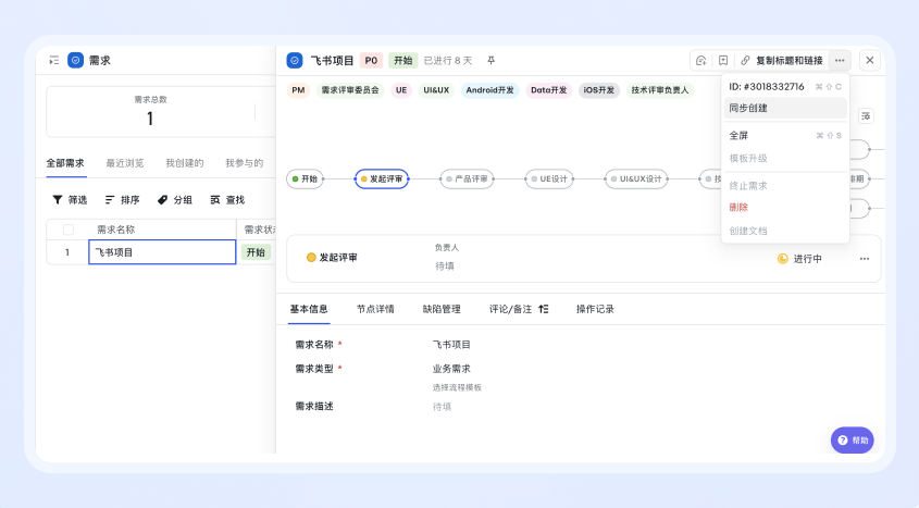 经过评估的需求自动同步创建至对应的业务产研空间内,并继承关键字段信息,正式进入需求开发环节。