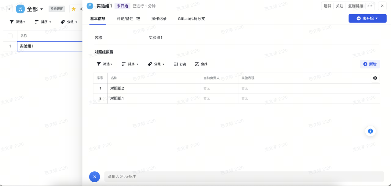 分别建立名为实验组和对照组的工作项,利用关联能力将二者数据互通,展开其中一组的详情页即可查看另一组的相关数据。
