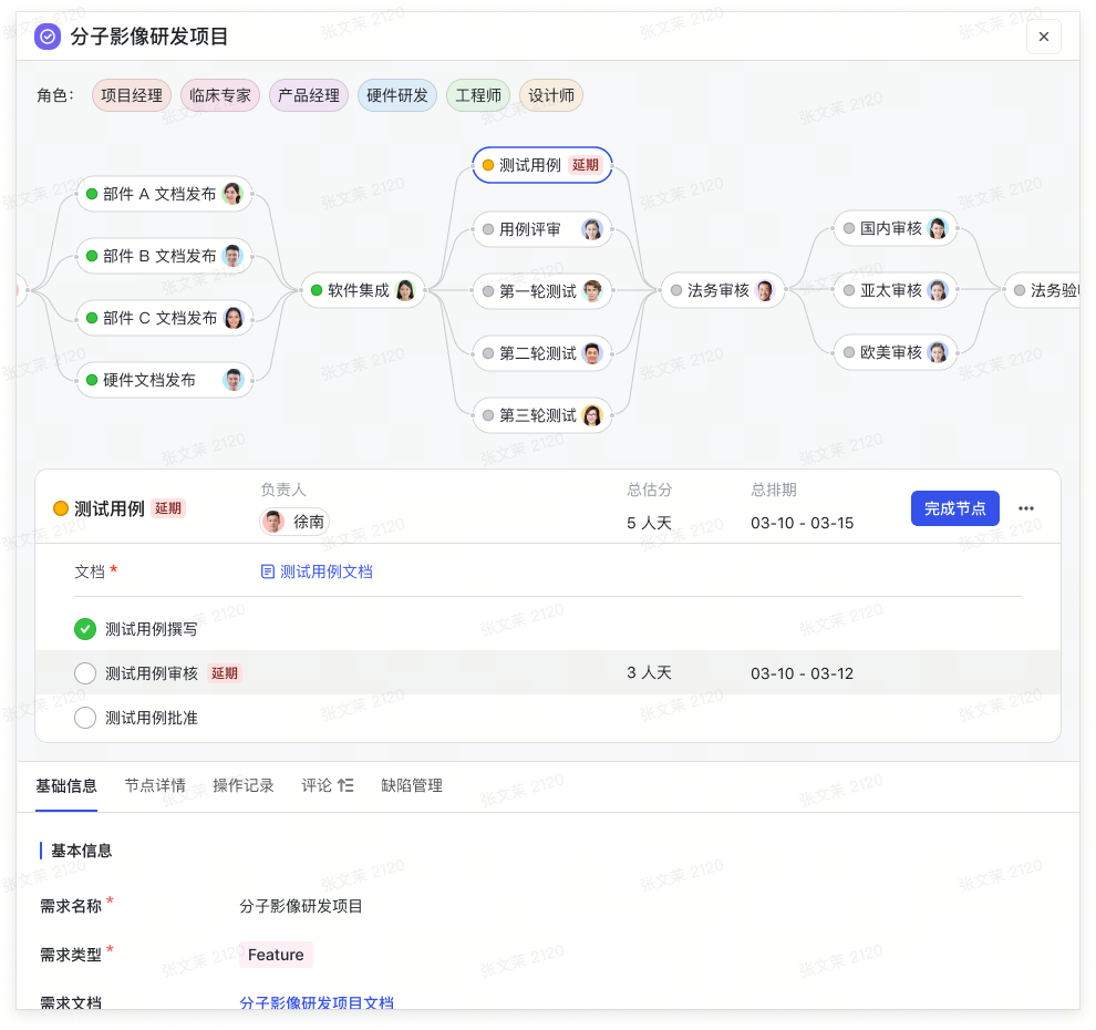 用灵活拆解和组合的工作流来规范流程。繁重的医疗器械研制流程能够被切割成具体可视的环节,抽象成一个个节点来记录,灵活的流程裁剪可适配不同情况的研制流程,项目成员自动入局。这样,项目有哪些阶段、哪些角色负责什么工作、项目进行到哪里了、上下游项信息是什么,一目了然。