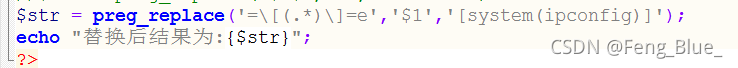 $处,存在e修饰符时,$reqlacement的值会被当成PHP代码来执行。列如下:在上述命令中,\\是一个转义字符,.*则就是当前(也就是括号里)。运行结果如下: