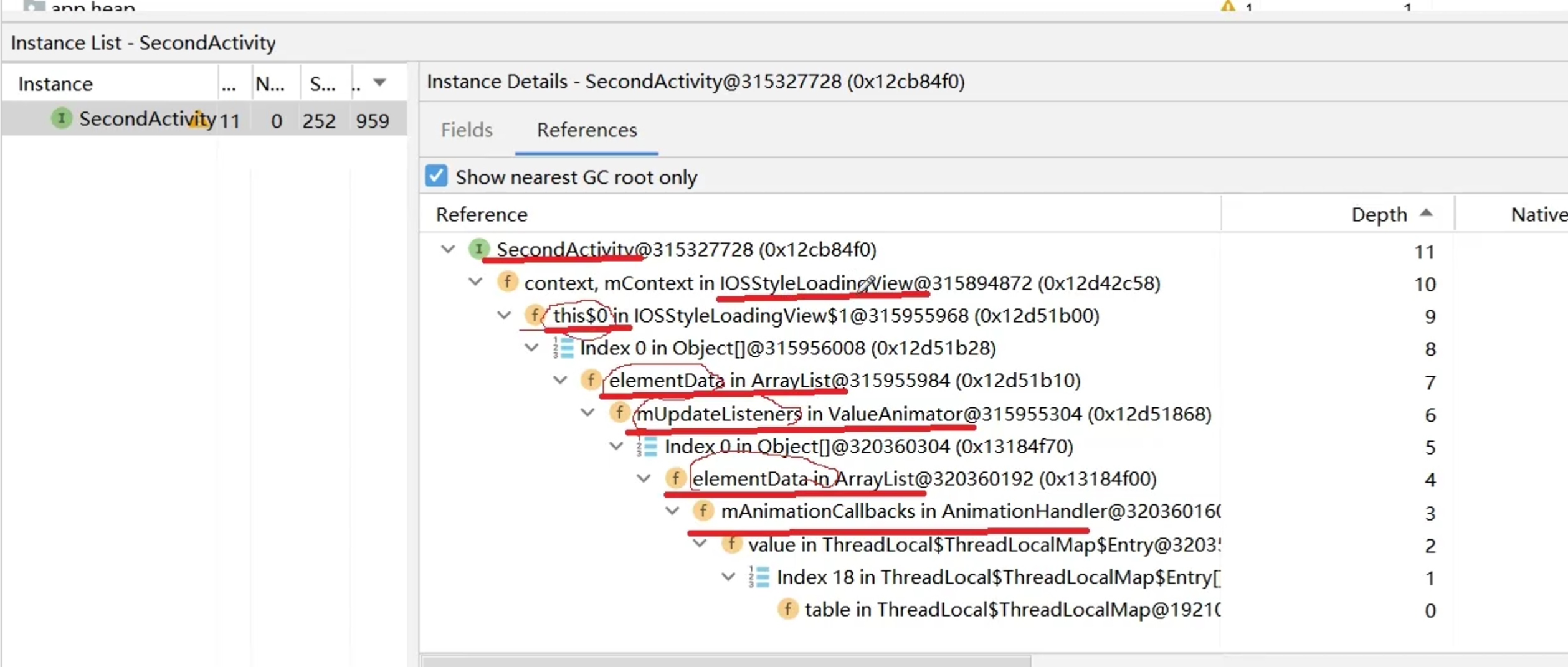 案例:从Activity A 跳转到 Activity B,B中有一个加载动画(只有启动动画的代码,没有结束的代码),然后再跳转回A,此时B的动画还在进行,出现内存泄漏。