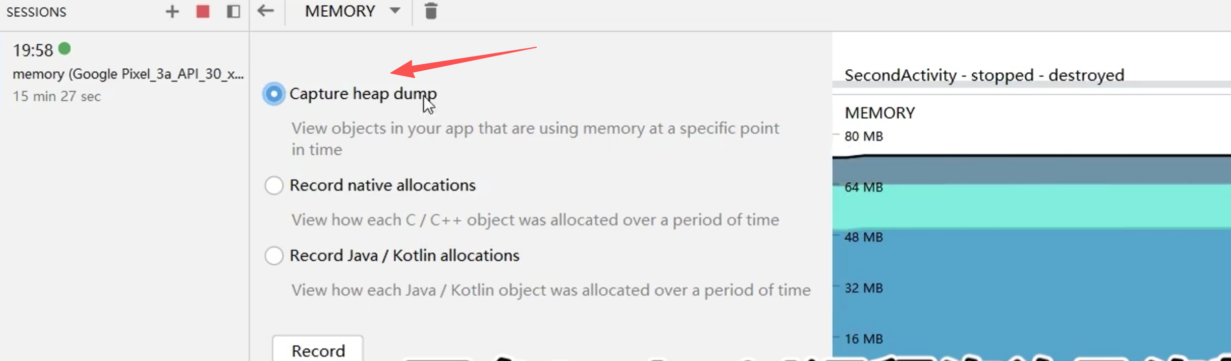 Memory Monitor定位内存泄漏:profile模式运行App,运行上述跳转过程,选择Capture heap dump查看对象使用内存情况。点击record。