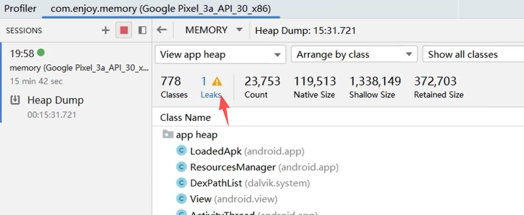 record之后等待生成,如图,Memory Monitor自动帮助定位到内存泄漏处。