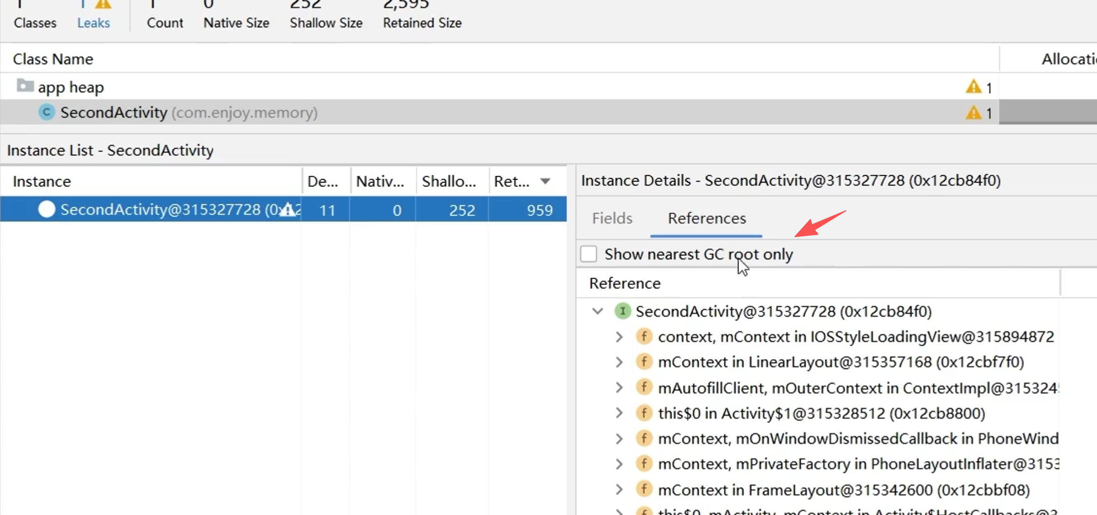点击可以查看引用链接(GC Roots):