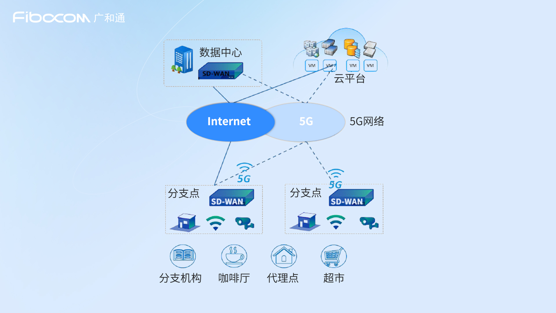 研华科技uCPE搭载广和通高性能5G模组可使SD-WAN按需为企业实现高速、安全、可靠的云端业务接入,在边缘与云端之间建立数据传输路径,并可在未部署有线网络的情况下便捷地通过5G网络实现零配置组网,部署周期从数周缩短至几小时,节省40%以上的广域网运营成本,同步提升30-40%的无线通信速率,大大发挥5G低时延及5G多切片能力。以远程监控及金融机构系统为例,总部和分支通过uCPE硬件设备能快速与总部IDC和云端建立安全可靠加密链路,帮助总部远程执行对分支的运营与管理。