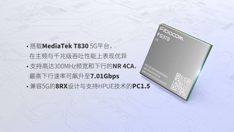 广和通5G模组FG370搭载性能卓越的MediaTek T830 5G平台,在主频与千兆级吞吐性能上表现优异。在5G速率及信号覆盖方面,FG370支持Sub-6GHz全频段5G网络,帮助终端用户畅享高速网络连接体验。FG370支持 FDD 和 TDD 混合模式下高达300MHz频宽和下行的NR 4CA(四载波聚合),最高下行速率可飙升至7.01Gbps;以及支持高达200MHz频宽和上行的NR 2CA(双载波聚合),最高上行速率可达2.5Gbps。