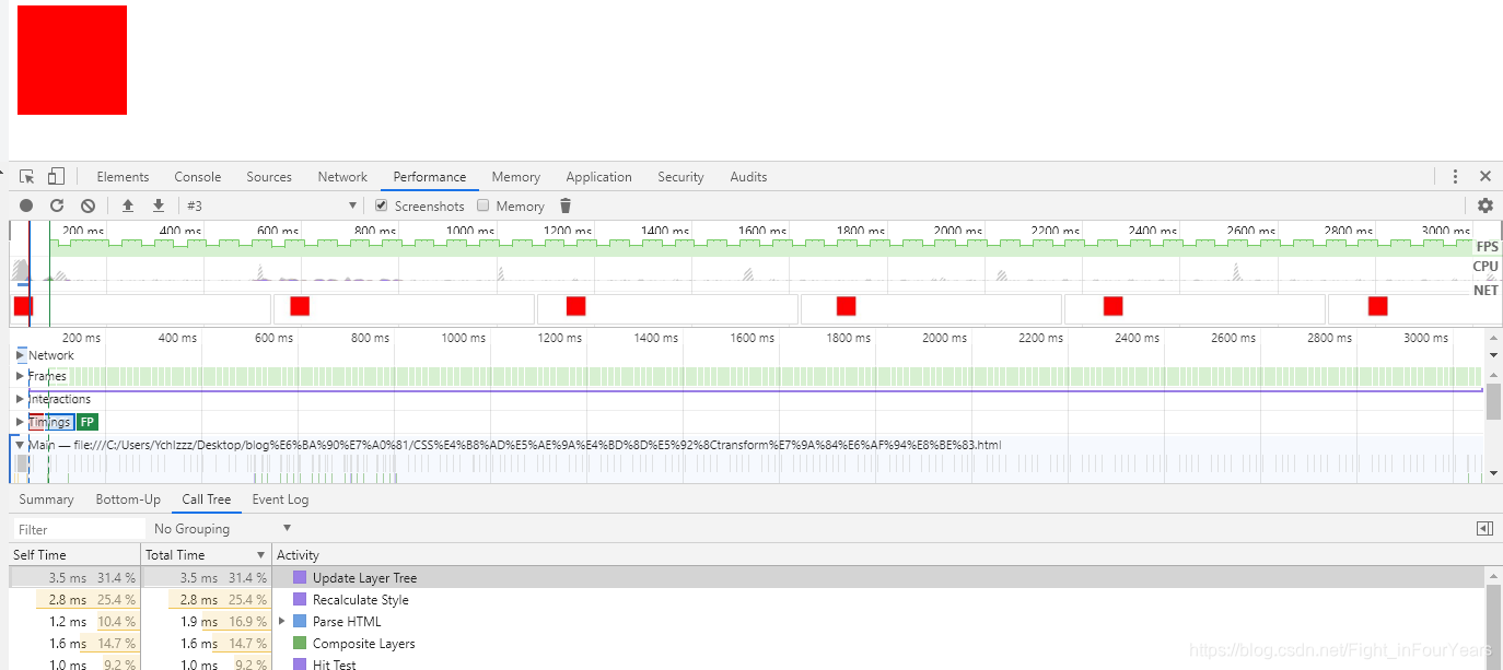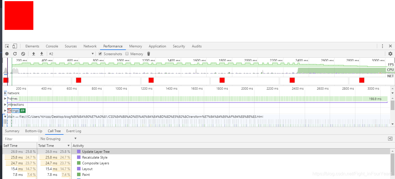 这张图片展示了move1也就是postion方法移动div的浏览器的性能测试,我们可以看到在前3s内浏览器重绘时间为 26.9ms,25.8ms,24.7ms总共加起来有80ms多。让我们再来看看move2,也就是transform的测试结果
