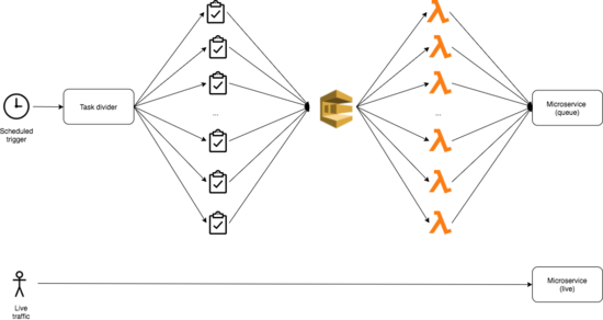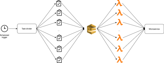 我们提出的用于处理微进程的解决方案是微服务架构的原生方案。 我们利用 SQS+Lambda 创建了一个推送队列,并调用一个微服务端点来执行微进程的任务。