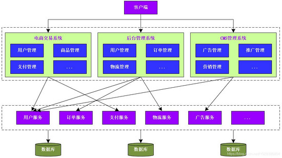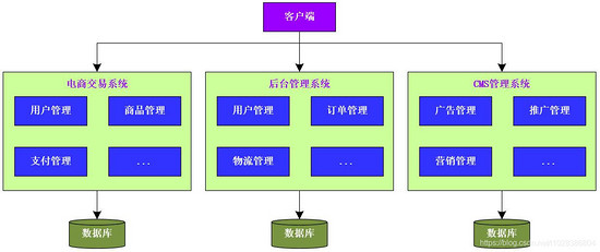 这里,我们同样以电商系统为例,在垂直应用架构下,我们可以将整个电商项目拆分为:电商交易系统、后台管理系统、CMS管理系统等。