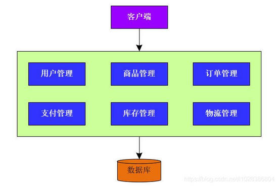 比如,大家都很熟悉的电商系统,里面涉及的业务主要有:用户管理、商品管理、订单管理、支付管理、库存管理、物流管理等等模块,初期我们会将所有模块写到一个Web项目中,然后统一部署到一个Web服务器中。