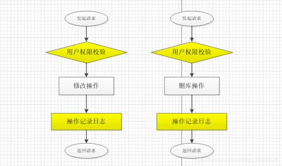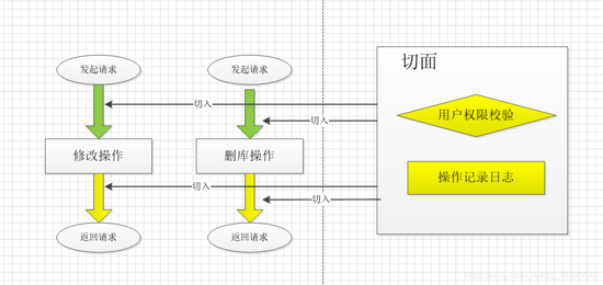 这样,代码冗余和可维护性的问题得到了解决,但每个业务方法中依然要依次手动调用这些公共方法,也是略显繁琐。有没有更好的方式呢?有的,那就是 AOP ,AOP将权限校验、日志记录等非业务代码完全提取出来,与业务代码分离,并寻找节点切入业务代码中:
