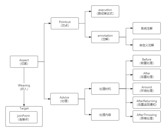 切入点(Pointcut):决定处理如权限校验、日志记录等在何处切入业务代码中(即织入切面)。切点分为execution方式和annotation方式。前者可以用路径表达式指定哪些类织入切面,后者可以指定被哪些注解修饰的代码织入切面。通知(Advice):我们也叫它处理(即“切面”对于某个“连接点”所产生的动作),包括处理时机和处理内容。处理内容就是要做什么事,比如校验权限和记录日志。处理时机就是在什么时机执行处理内容,分为前置处理(即业务代码执行前)、后置处理(业务代码执行后)等。切面(Aspect):即Pointcut和Advice。连接点(Joint point):是程序执行的一个点。例如,一个方法的执行或者一个异常的处理。在 Spring AOP 中,一个连接点总是代表一个方法执行。织入(Weaving):就是通过动态代理,在目标对象方法中执行处理内容的过程。目标对象(Target Object):被一个或者多个切面所通知的对象。AOP代理(AOP Proxy)在Spring AOP中有两种代理方式,JDK动态代理和CGLIB代理。