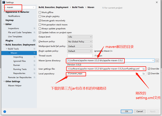 下载了 idea 后,在 file-》settings 中搜索 maven,将你刚解压的 maven 目录填上