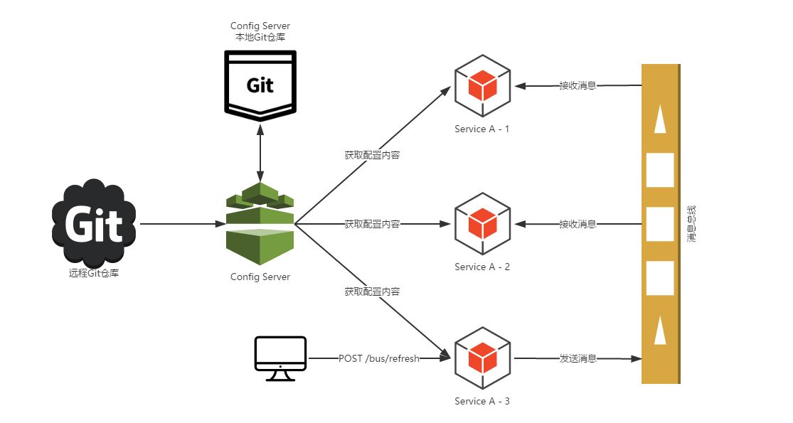 此时,若我们需要修改“Service A”的属性。首先,通过Git管理工具去仓库中修改对应的属性值,但是这个修改并不会触发“Service A”实例的属性更新。我们向“Service A”的实例3发送POST请求,访问/bus/refresh接口。此时,“Service A”的实例3就会将刷新请求发送到消息总线中,该消息事件会被“Service A”的实例1和实例2从总线中获取到,并重新从Config Server中获取他们的配置信息,从而实现配置信息的动态更新。