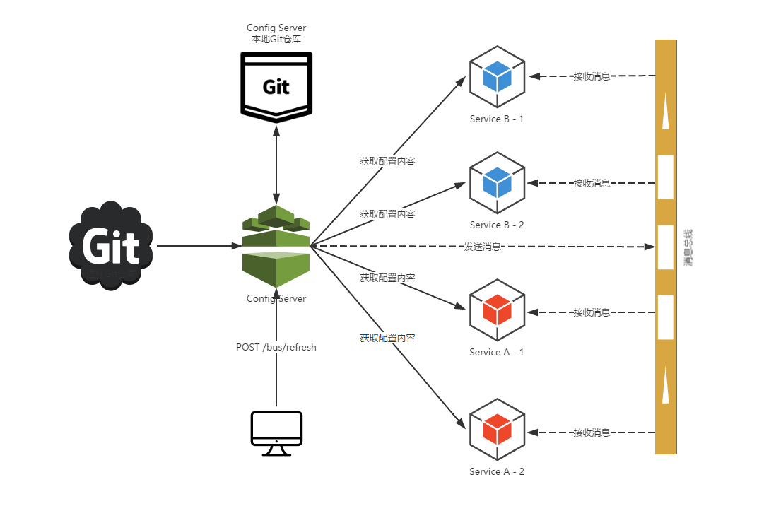 通过上面的改动,我们的服务实例就不需要再承担触发配置更新的职责。同时,对于Git的触发等配置都只需要针对Config Server即可,从而简化了集群上的一些维护工作。