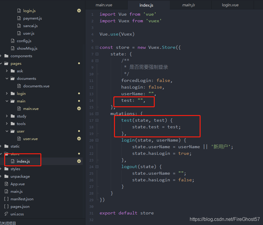 如上图,在store的index.js中,已预先设置好了test调用方法,因此在这里使用赋值时,main.vue绑定了test方法关联的test状态变量,就已经被更改了