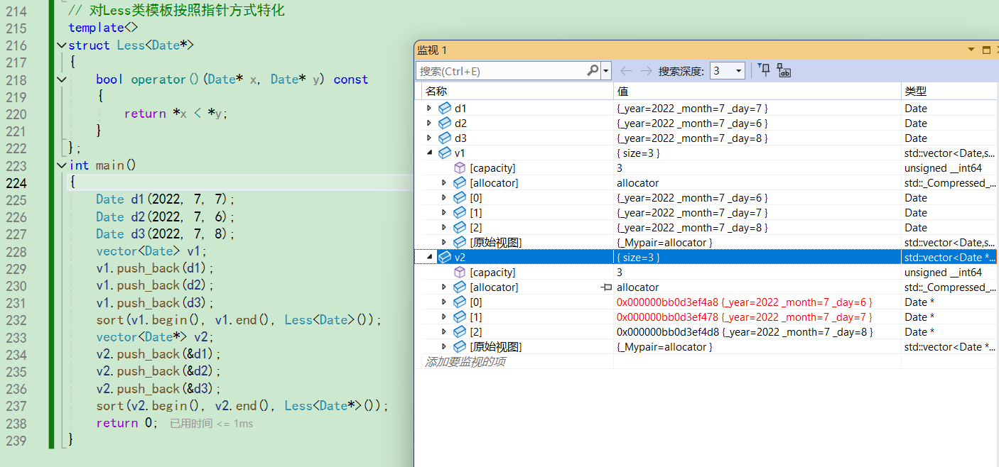 // 但是走Less模板,sort在排序时实际比较的是v2中指针的地址,因此无法达到预期