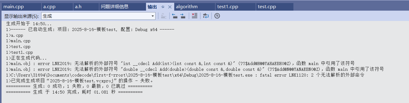假如有以下场景,模板的声明与定义分离开,在头文件中进行声明,源文件中完成定义: