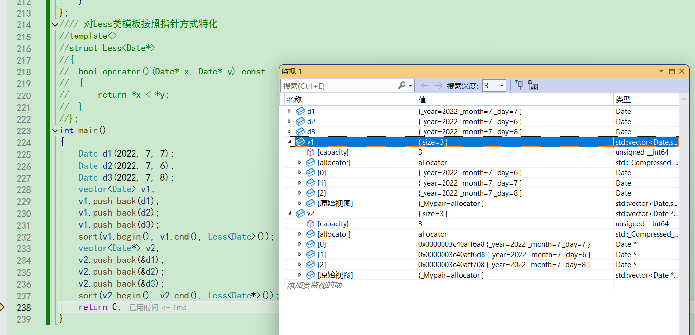 sort(v2.begin(), v2.end(), Less<Date*>());