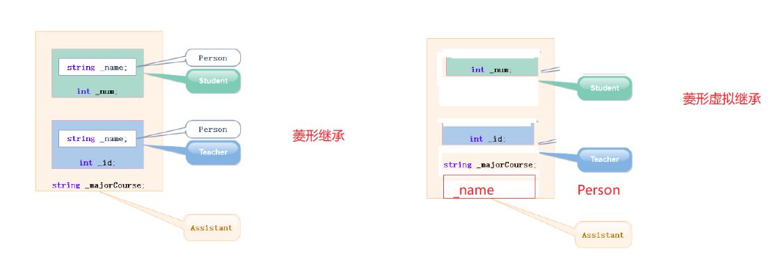 3.菱形继承:菱形继承是多继承的⼀种特殊情况。菱形继承的问题,从下⾯的对象成员模型构造,可以看出菱形继承有数据冗余和⼆义性的问题,在Assistant的对象中Person成员会有两份。⽀持多继承就⼀定会有菱形继承,像Java就直接不⽀持多继承,规避掉了这⾥的问题,所以实践中我们也是不建议设计出菱形继承这样的模型的。