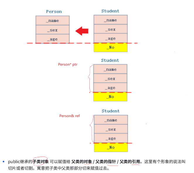 public继承的子类对象可以赋值给父类的对象/指针/引⽤。