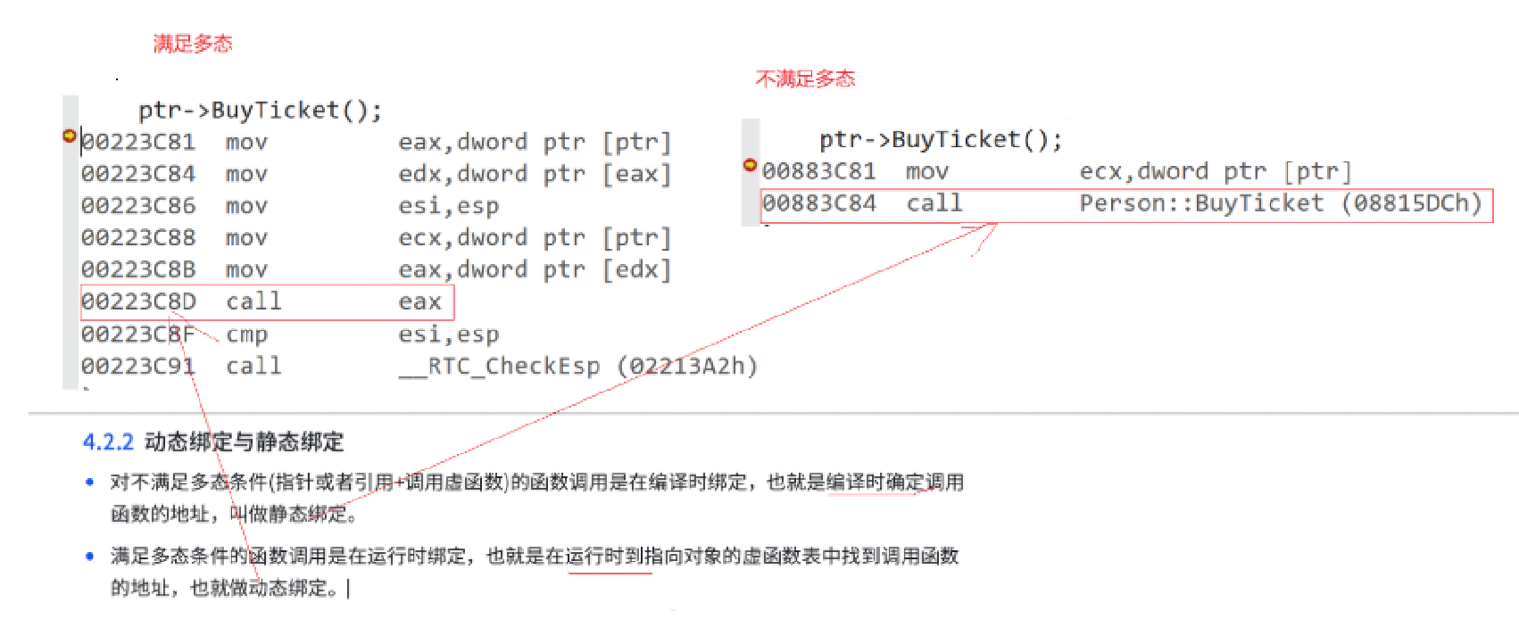 通过下图我们可以看到,满⾜多态条件后,底层不再是编译时通过调⽤对象确定函数的地址,⽽是
