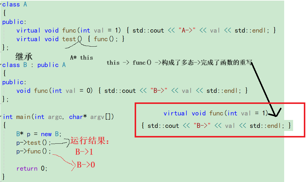 virtual void func(int val = 1) { std::cout << "A->" << val << std::endl; }
