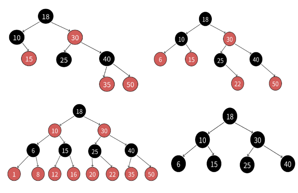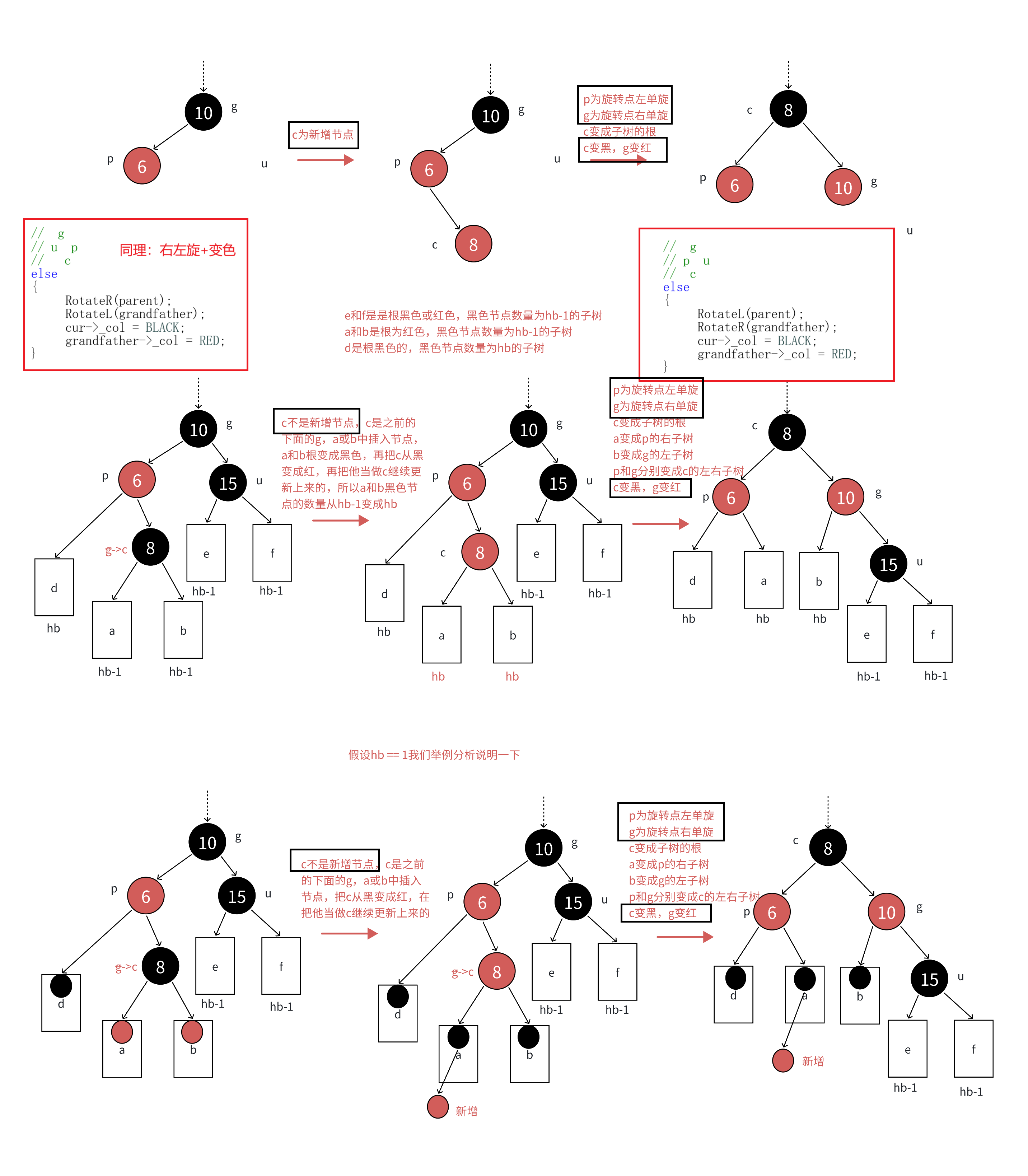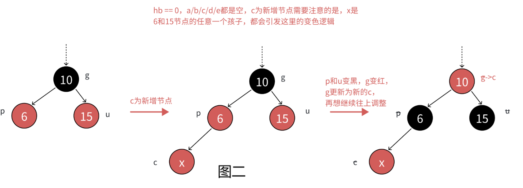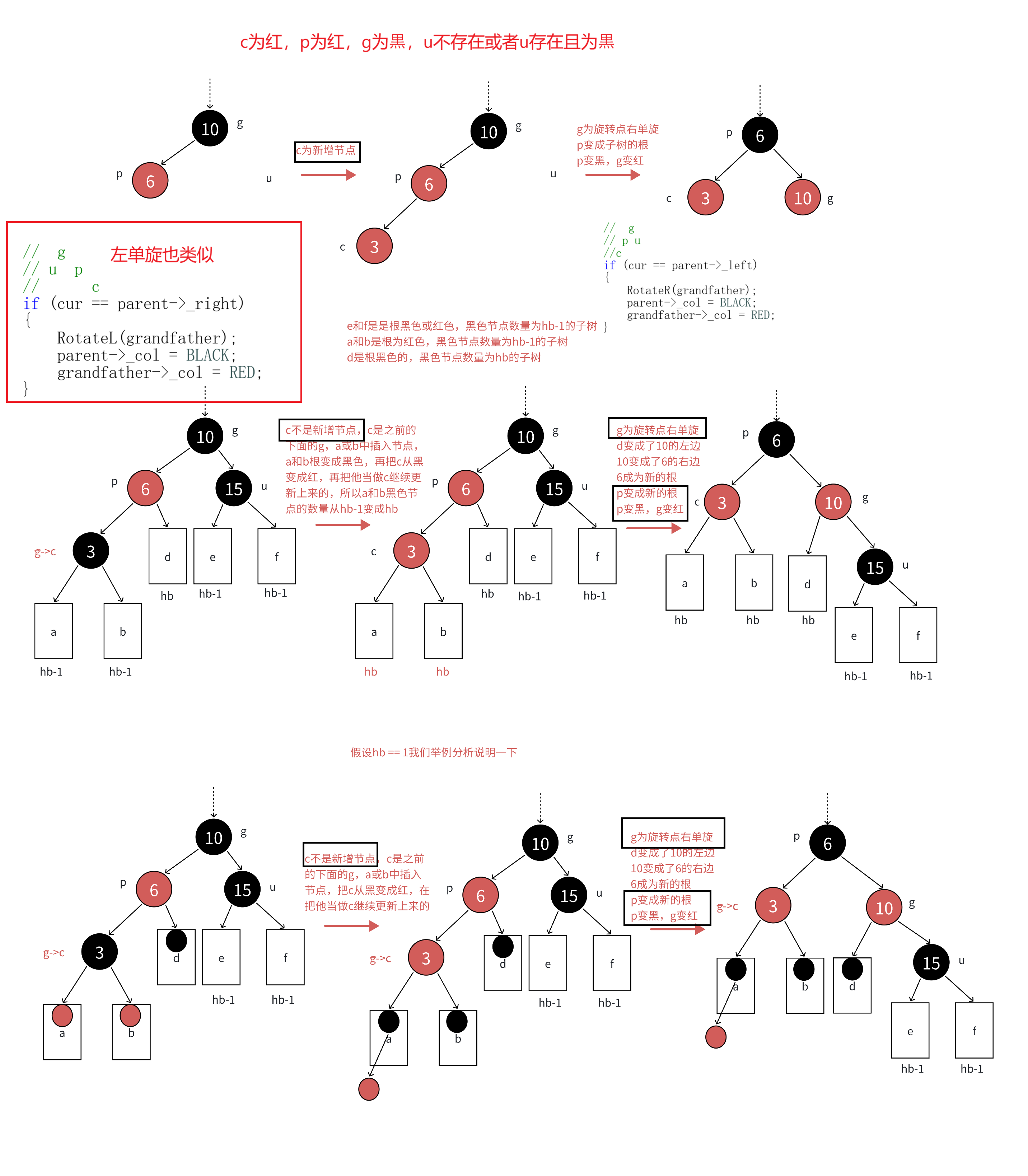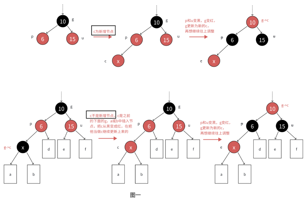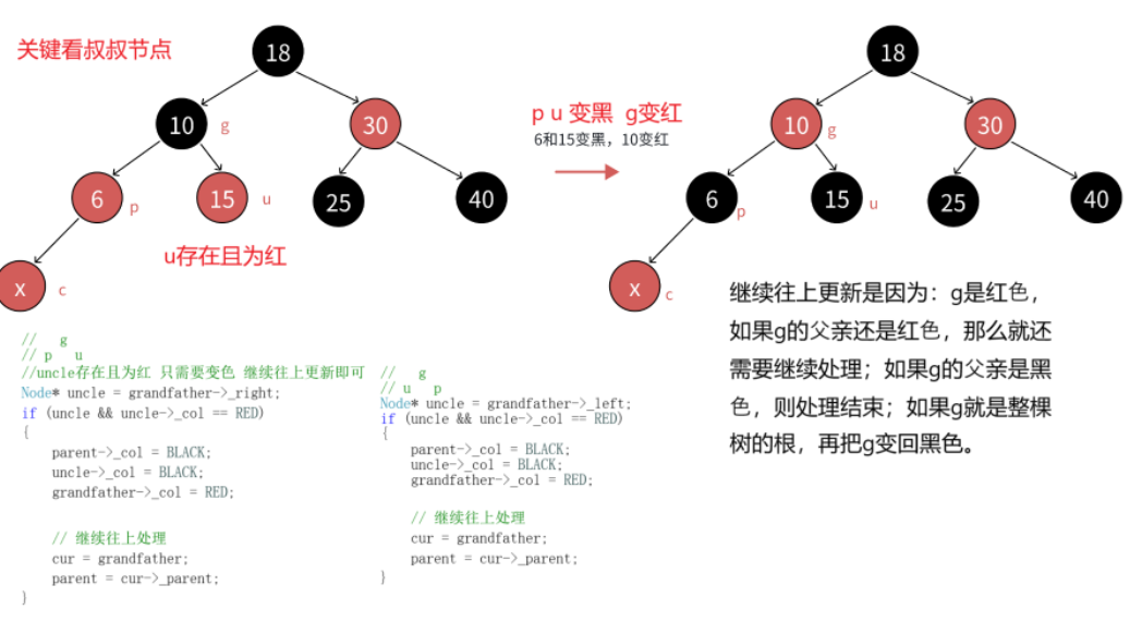 c为红,p为红,g为⿊,u存在且为红,则将p和u变⿊,g变红。在把g当做新的c,继续往上更新。