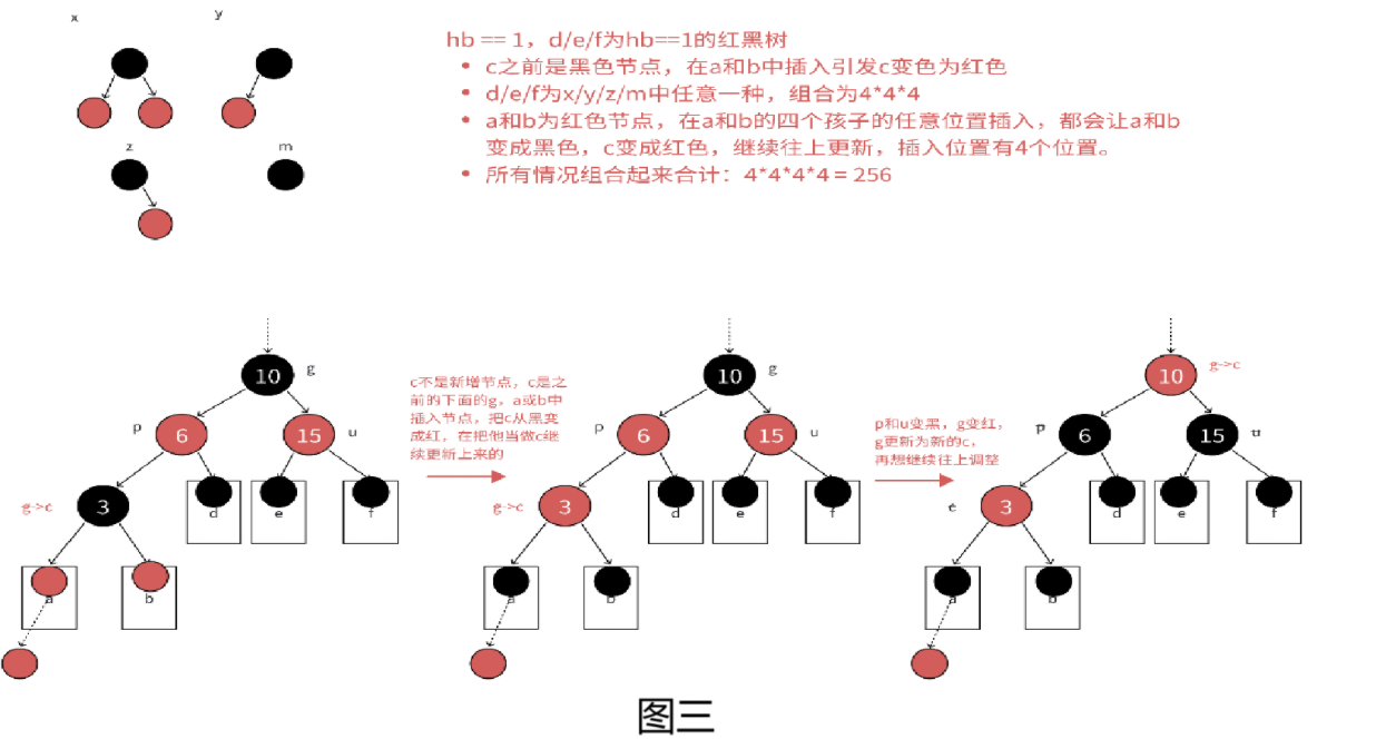,u不存在,则c⼀定是新增结点,u存在且为⿊,则c⼀定不是新增,c之前是⿊⾊的,是在c的⼦树中插⼊,符合情况1,变⾊将c从⿊⾊变成红⾊,更新上来的。