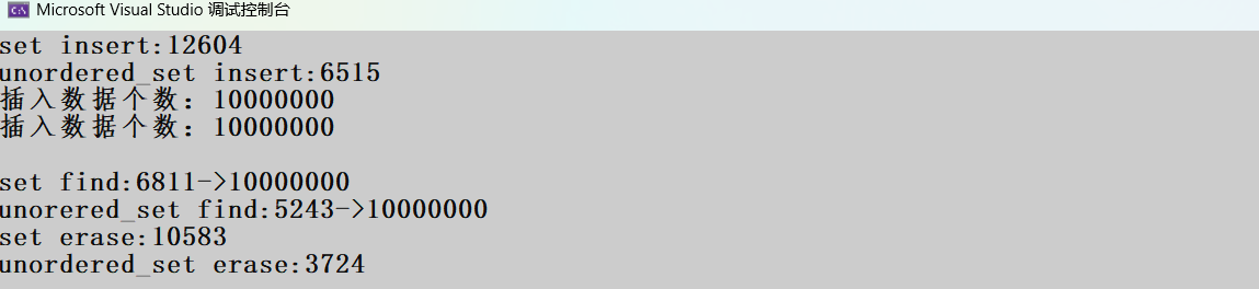 cout << "unorered_set find:" << end4 - begin4 << "->" << m2 << endl;