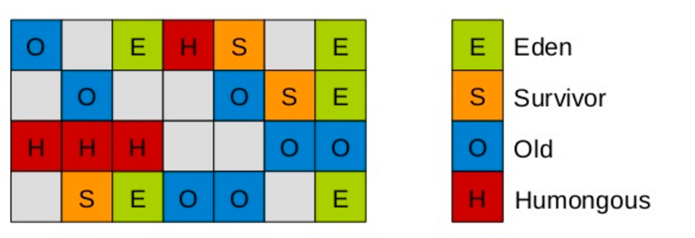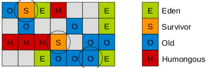 G1与其他垃圾收集器不同之处在于,heap被划分为一系列大小相等的“小堆区”,也称为region。每个小堆区(region)的大小为1~32MB,整个堆默认划分出2048个小堆区。与上一代的垃圾收集器一样在逻辑上被划分Eden、Survivor和老年代,但是各种角色的region个数都不是固定的。下图中的绿色代表Eden小堆区、黄色为Survivor小堆区、蓝色则为老年代小堆区、而灰色则会未被使用的区域。