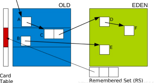 在CMS中,也有RSet的概念,在老年代中有一块区域用来记录指向新生代的引用。这是一种point-out,在进行Young GC时,扫描根时,仅仅需要扫描这一块区域,而不需要扫描整个老年代。