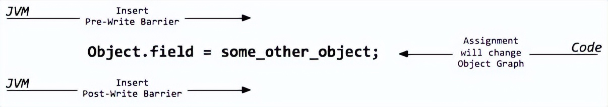 我们首先介绍一下栅栏(Barrier)的概念。栅栏是指在原生代码片段中,当某些语句被执行时,栅栏代码也会被执行。而G1主要在赋值语句中,使用写前栅栏(Pre-Write Barrrier)和写后栅栏(Post-Write Barrrier)。事实上,写栅栏的指令序列开销非常昂贵,应用吞吐量也会根据栅栏复杂度而降低。