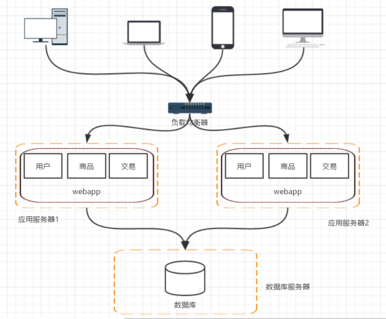 这个阶段,随着访问量的继续不断增加,单台应用服务器已经无法满足我们的需求。 假设我的数据库服务器还没有遇到性能问题,那我们可以通过增加应用服务器的方式来将应用服务器集群化,这样就可以将用户请求分流到各个服务器中,从而达到继续提升系统负载能力的目的。此时各个应用服务器之间没有直接的交互,他们都是依赖数据库各自对外提供服务。