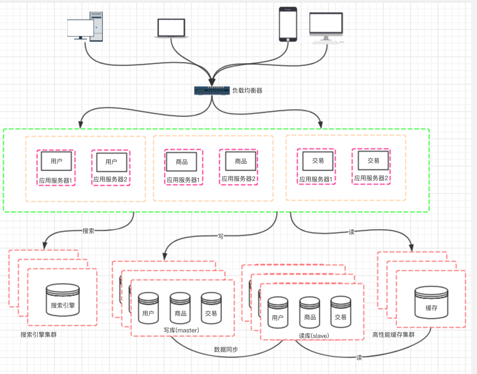 架构演变到上面的阶段,并不是终点。通过上面的设计,应用层的性能被我们拉上来了, 但数据库的负载也在逐渐增大,那如何去提高数据库层面的性能呢?有了前面的设计思路以后,我们自然也会想到通过增加服务器来提高性能。但假如我们单纯的把数据库一分为二,然后对于数据库的请求,分别负载到两台数据库服务器上,那必定会造成数据库数据不统一的问题。 所以我们一般先考虑将数据库读写分离。