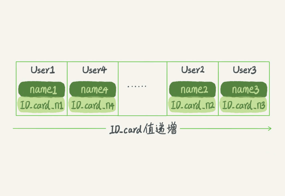 需要注意的是,图中四个 ID_card_n 的值并不是递增的,这样做的好处是增加新的 User 时速度会很快,只需要往后追加。但缺点是,因为不是有序的,所以哈希索引做区间查询的速度是很慢的。