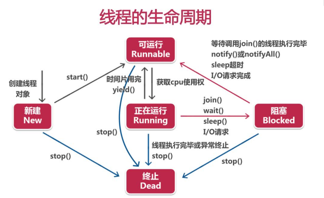 销毁 如果线程正常执行完毕后或线程被提前强制性的终止或出现异常导致结束,那么线程就要被销毁,释放资源