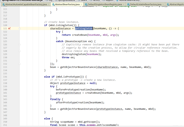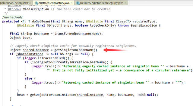 仍旧在AbstractBeanFactory的doGetBean方法中。如下代码所示,首先运行createBean方法,其次会调用getSingleton方法。
