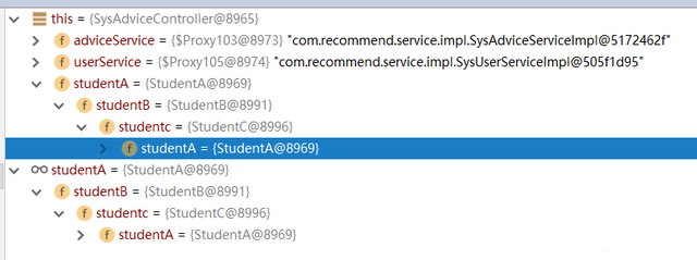 结合我们的实例来看,当Spring实例化了StudentA、StudentB、StudentC后,紧接着会去设置对象的属性,此时StudentA依赖StudentB,就会去Map中取出存在里面的单例StudentB对象,以此类推,不会出现循环的问题。