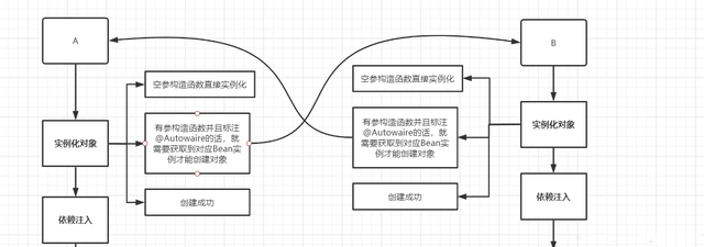 这样当执行到populateBean时 ,如果两个对象相互依赖,那么当前对象(假设为A)的实例化就会触发另外一个对象(假设为B)的实例化。当B实例化时其又依赖了A就会从三级缓存(或二级缓存)获取A的引用完成实例化从而最终完成A的实例化。