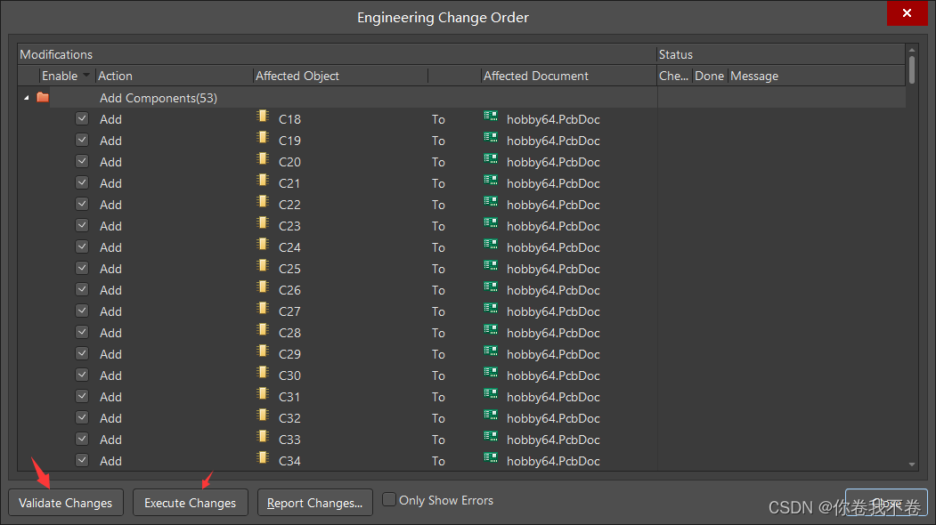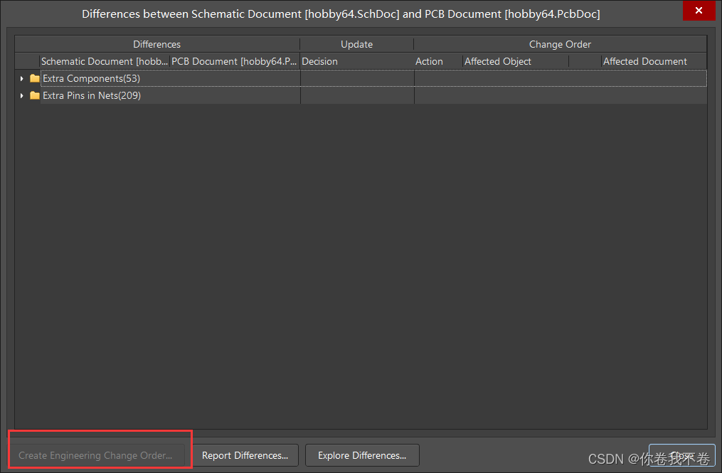在这个界面上点击鼠标右键,选择 Update all in>>PCB Document [xxx.PcbDoc] ,然后会发现 Create Engineering Change Order... 按钮变成了黑色的可点击状态,此时点击该按钮,得到如下界面: