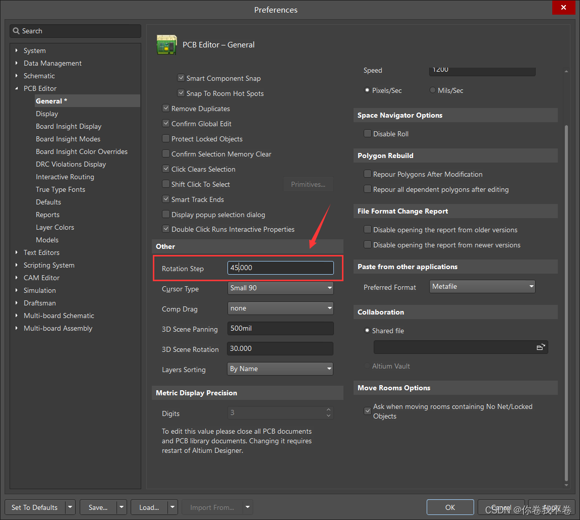 依次打开 Tool -> Preferences -> PCB Editor -> General,将 Rotation Step 由 90 改为 45