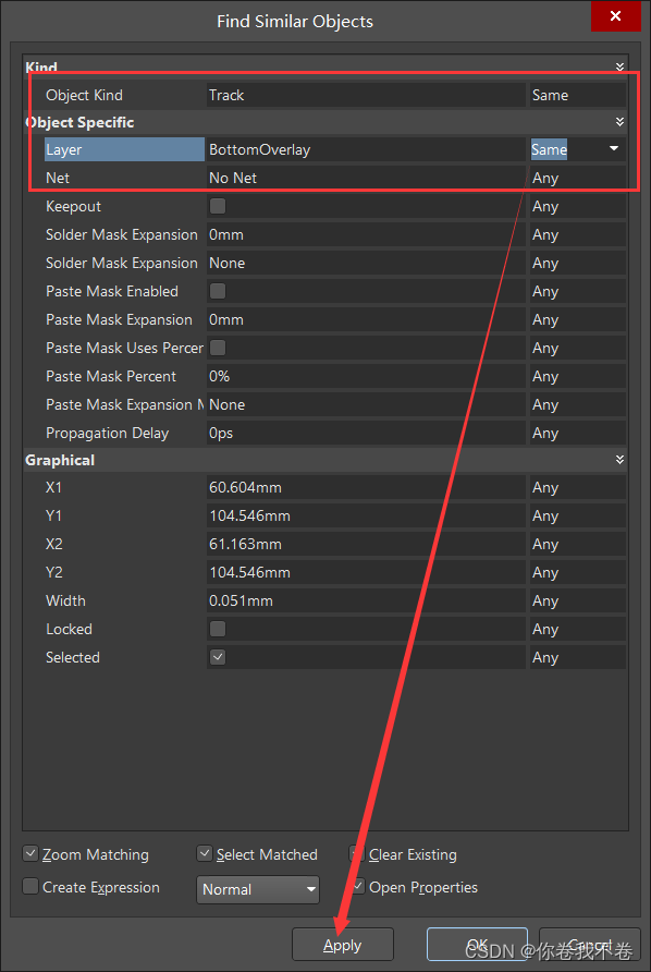 然后在这根线上点击右键,选择 Find Similar Objects... ,然后如下设置
