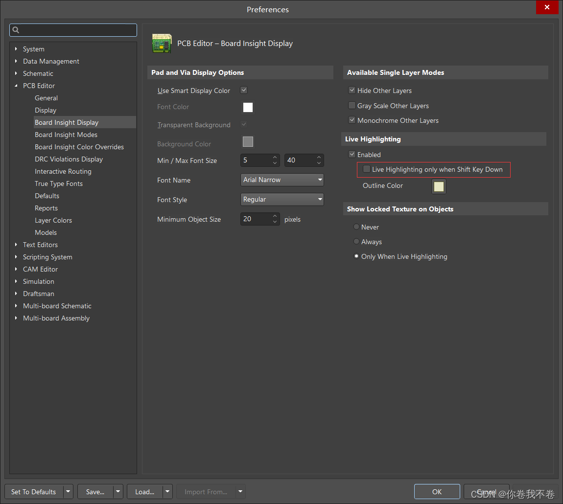 菜单栏 —> Tools —> Preferences —> PCB Editor —> Board Insight Display —> 去掉 Live Highlighting only when Shift Key Down 选项,如下: