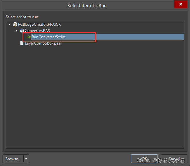 然后依次打开 AD 的 File -> Run Script... ,在 Browse... 中选择 From file... ,在刚才下载的文件夹中选择 PCBLogoCreator.PRJSCR 文件打开,然后点击下图选项后点击 OK 。