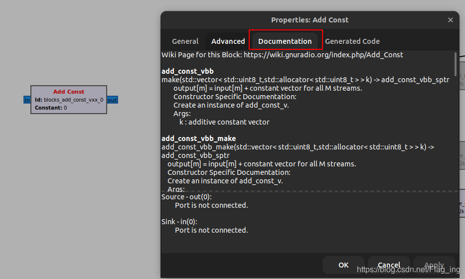 理解起来很简单,其实 documentation 中包含的是与这个 block 有关的信息,在 GRC 中的显示就是 Documentation 标签栏中的内容,如: