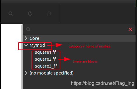 类别名称即 module(注意与 block 的区别) 的名字,类别名称必须括在方括号中才能起作用。可视化效果如下,图中 square1_ff、square2_ff、square3_ff 相应的 category 属性都应该为 '[Mymod]' 。